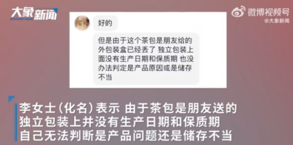 随后,当事人李女士对媒体表示,茶包是朋友送的,无法判断是产品问题还是储存不当。