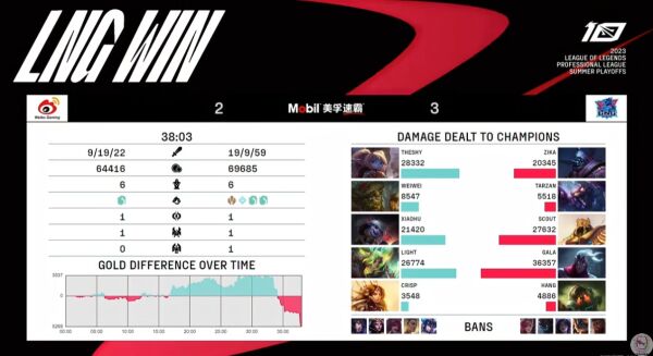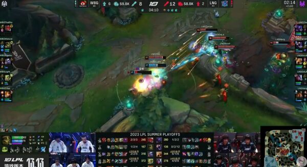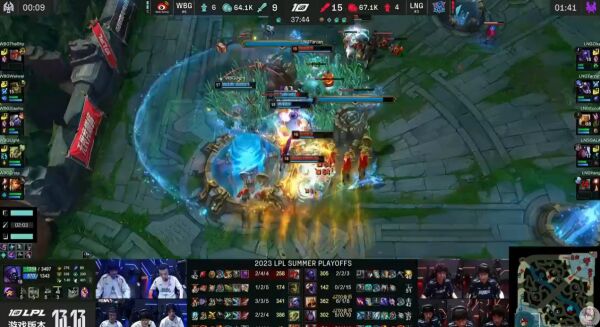 前期WBG的推进节奏比LNG要好,虽然蝎子抓到了人,但是经济差一直无法拉开。反而是WBG打出了防御塔5-0的小高潮,甚至不到20分钟就破掉了LNG的中路高地塔。不过,蝎子还是在中后期的团战中展现出了威慑力,不仅让WBG的中下辅三人都买了水银,关键团前也是利用蝎子率先秒了Theshy的波比,随后LNG贾克斯关键眩晕打赢团战破路拿下了远古龙。