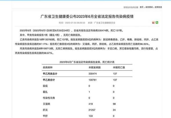 央广网广州7月25日消息,7月25日,广东省卫生健康委发布《2023年6月全省法定报告传染病疫情》。根据通报,2023年6月(2023年6月1日0时至6月30日24时),广东全省共报告法定传染病330474例,死亡137例,其中甲类传染病报告1例(霍乱1例),无死亡病例报告。