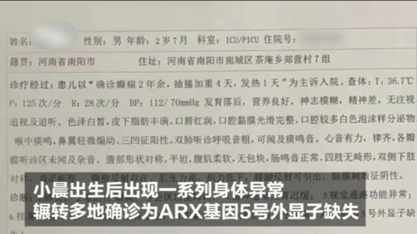 患病儿子的母亲称,儿子是2020年三月12号出生的,儿子出生后出现一系列身体异常。2021年6月份,在郑大三附院通过基因外检的形式,检测出孩子患上了罕见病,ARX基因5号外显子缺失,这个疾病是可以摧毁神经系统的,所以我们的儿子从小就丧失了,正常可以感知这个世界的能力。
