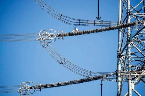 送变电检修人员对特高压线路进行走线检查,确保华东电网安全可靠供电。图/中新