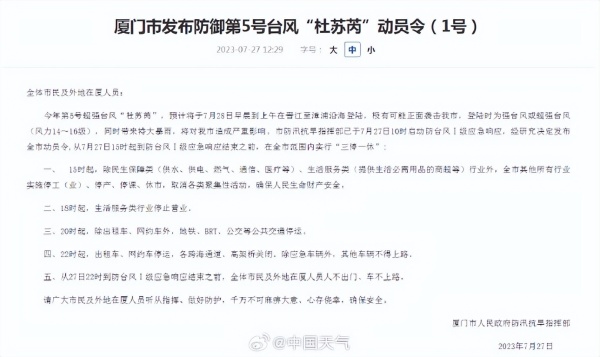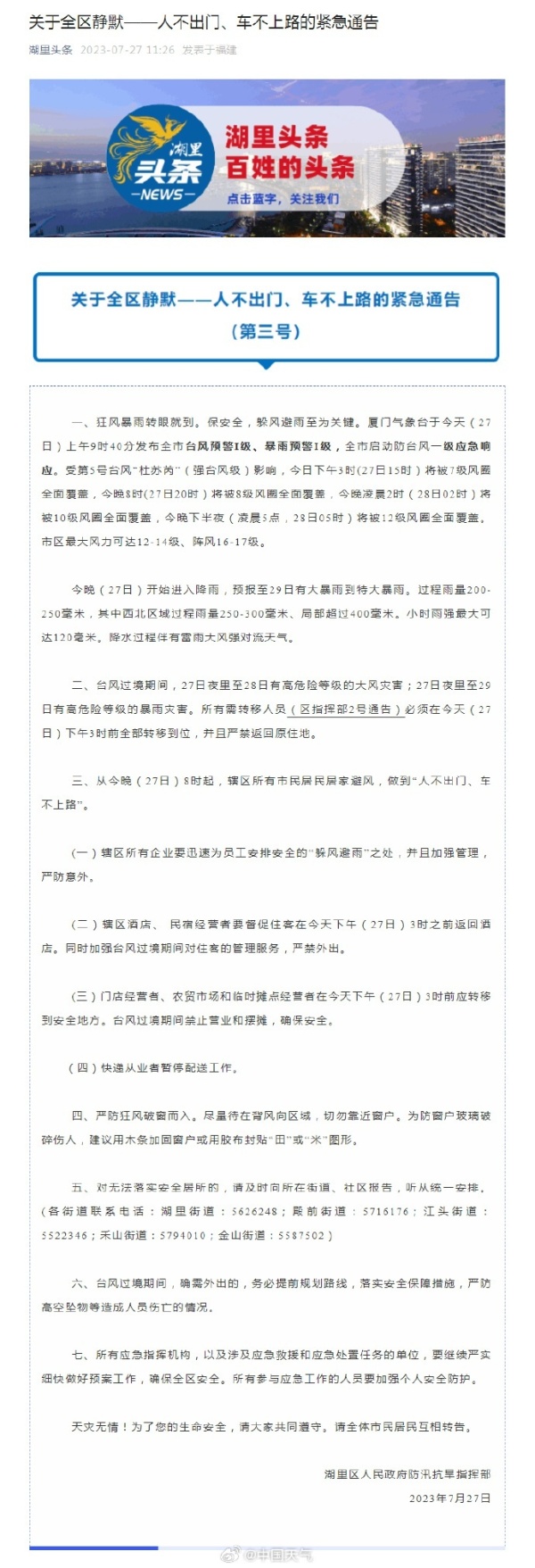 据厦门市人民政府防汛抗旱指挥部消息,今天(7月27日)上午全市启动防台风一级应急响应,从今天15时起到防台风一级应急响应结束之前,全市范围内实行“三停一休”;另据湖里区人民政府办公室消息,今晚8时厦门将被8级风圈全面覆盖,今晚凌晨2时(28日02时)将被10级风圈全面覆盖,今晚下半夜(凌晨5点,28日05时)将被12级风圈全面覆盖。从今晚8时起,辖区所有市民居民居家避风,做到“人不出门、车不上路”,全区静默。
