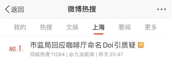7月28日,“市监局回应咖啡厅命名Doi引质疑”登上上海同城热搜第一。