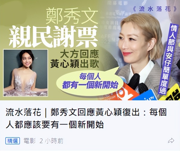 2月13日,据港媒报道,乐坛天后郑秀文出席了新电影《流水落花》的谢票活动,受访时她首度谈及老公的出轨对象黄心颖。