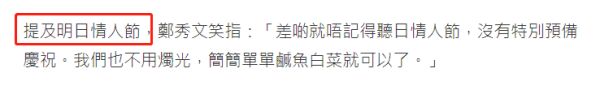问到2月14日情人节如何庆祝?郑秀文笑言差点不记得这个节日,没有特别预备庆祝,夫妻俩不用烛光,简简单单咸鱼白菜就可以。