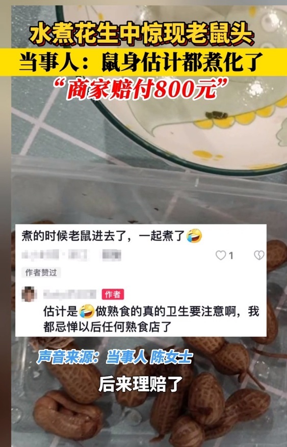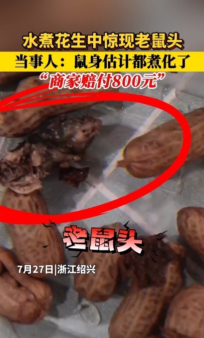7月28日,据闪电新闻报道,近日在浙江绍兴,一女子称自己在购买的水煮花生中发现老鼠头,此事引发关注。