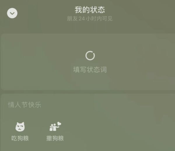 鞭牛士 2月14日消息,今日是情人节,微信上线了“撒狗粮”“吃狗粮”等情人节限定状态,设置后24小时可见。