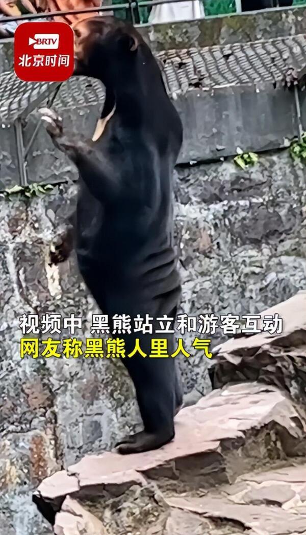 视频中,黑熊站立和游客互动,网友称黑熊“人里人气”。