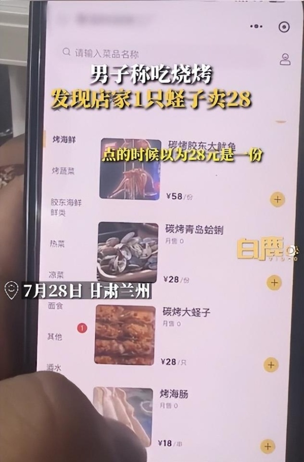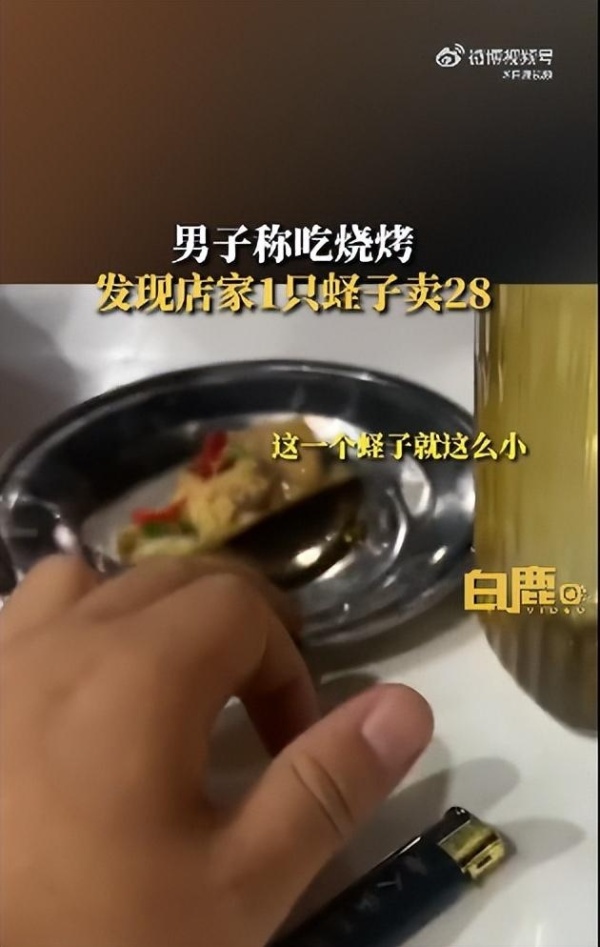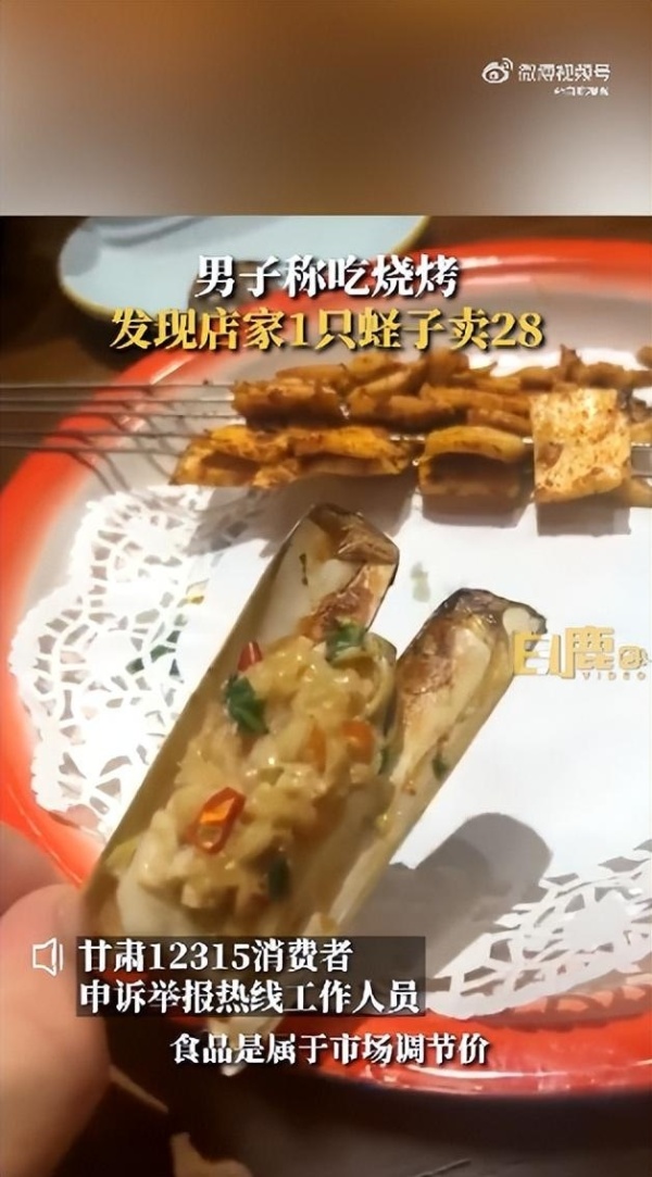 7月29日,据陕西网“白鹿视频”报道,7月28日,在甘肃兰州,一男子称在烧烤店点价格为28元的碳烤蛏子,上桌发现盘里仅有1只蛏子。
