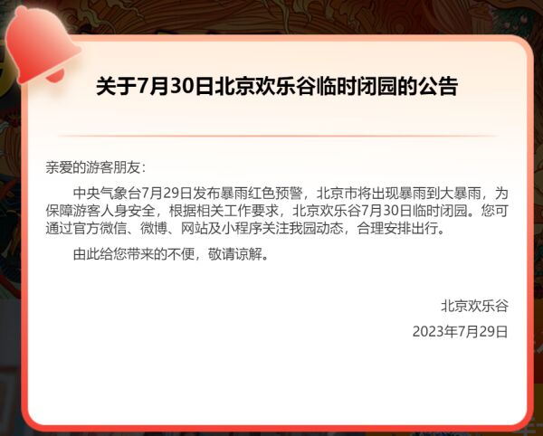 北京欢乐谷29日发布消息,中央气象台7月29日发布暴雨红色预警,北京市将出现暴雨到大暴雨,为保障游客人身安全,根据相关工作要求,北京欢乐谷7月30日临时闭园。您可通过官方微信、微博、网站及小程序关注我园动态,合理安排出行。