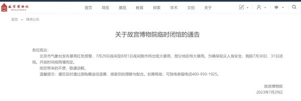 故宫博物院29日晚发布临时闭馆通告:北京市气象台发布暴雨红色预警,7月29日夜间至8月1日夜间本市将出现大暴雨,部分地区特大暴雨。为确保观众人身安全,故宫博物院7月30日、31日闭馆。开放时间视雨情而定。