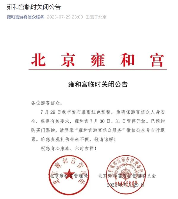 雍和宫29日晚发布消息,7月29日我市发布暴雨红色预警,为确保游客信众人身安全,根据有关要求,雍和宫7月30日、31日暂停开放。已预约购买门票的,请登录“雍和宫游客信众服务”微信公众号自行退票。给您参观礼佛带来不便,敬请谅解!