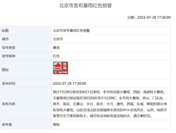 北京市防汛指挥部发布9条应对全市防汛红色(一级)预警措施