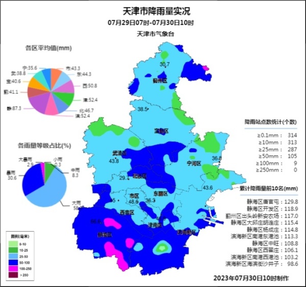 央广网天津7月30日消息(记者周思杨)记者从天津市气象局获悉,7月29日7时至7月30日11时,天津市降雨区平均降雨量54.2毫米,最大降雨量132.7毫米,出现在静海区唐官屯镇,最大小时降雨量54.8毫米,出现在静海区台头镇。中心城区降雨区平均降雨量48.2毫米,最大降雨量67.1毫米,出现在河西区恒山里,次大降雨量66.9毫米,出现在河西区汉江里。天津市各地区平均降雨量为:市内六区48.2毫米(河西区56毫米,和平区49.7毫米,河东区45.9毫米,南开区43.7毫米,红桥区50.1毫米,河北区38.4毫米),北部地区50.5毫米(蓟州区46.4毫米,宝坻区54.5毫米,武清区54.9毫米),环城四区53.5毫米(西青区56.3毫米,津南区54.9毫米,东丽区48.7毫米,北辰区54毫米),东部地区49.8毫米(滨海新区53.8毫米,宁河区40.7毫米),静海区96.7毫米。