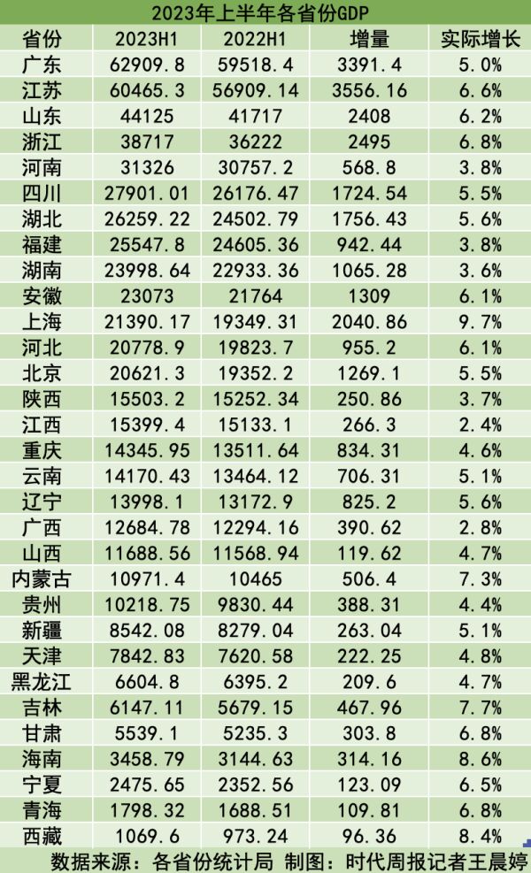 至此,31个省份均已公布上半年经济数据。前6名省份位次未有变化,广东、江苏、山东、浙江、河南、四川6个经济大省挑起“稳增长”大梁。