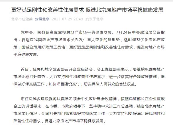 7月29日晚间,北京市住建委公众号“安居北京”发布题为《更好满足刚性和改善性住房需求促进北京房地产市场平稳健康发展》的文章,全文如下: