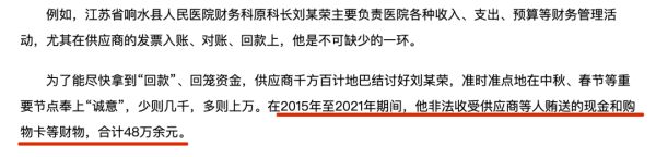 江苏省响水县人民医院财务科原科长刘某荣,短短几年就收了48万的贿赂。