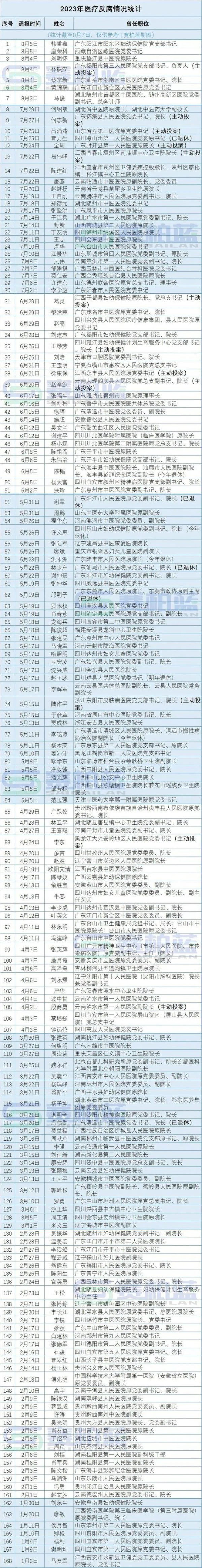 据行业媒体赛柏蓝不完全统计,截至8月6日,全国已公开通报被查的医院院长、书记已达到168位,其中有约12起为涉事人主动投案。