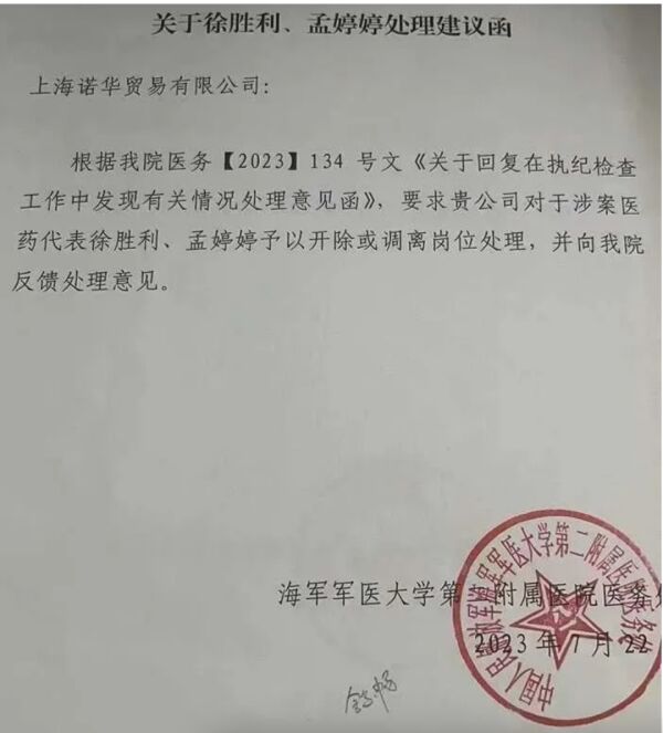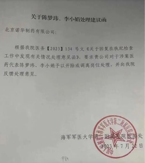 7月22日,上海一医院分别向上海诺华贸易有限公司和北京诺华制药有限公司发送了处理建议函,要求他们开除4名涉案代表。