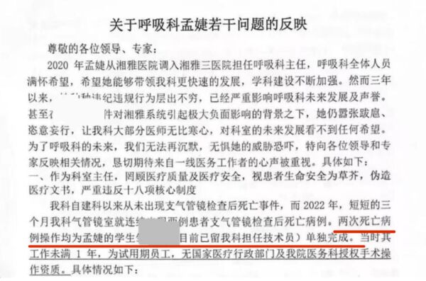 长沙湘雅三医院的9名医务人员,联名举报了该院呼吸科主任孟婕。