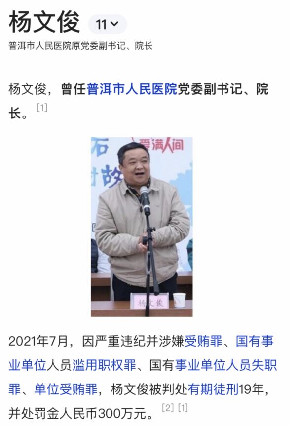 云南省普洱市人民医院原院长杨文俊,顶着其他院领导的反对压力,执意购买一台进口价1500万元的医疗器械直线加速器,最终吃掉了1600万回扣。