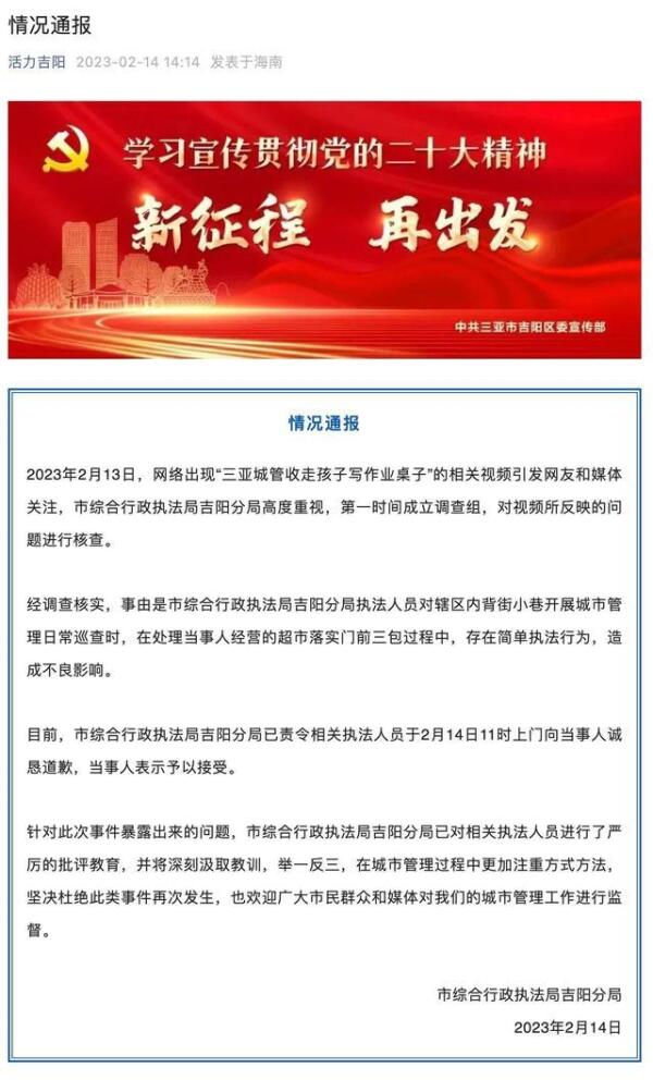 导读:2月13日,“三亚城管收走孩子写作业桌子”的视频引发关注。14日,官方通报:落实门前三包过程中,存在简单执法行为,已上门向当事人诚恳道歉。