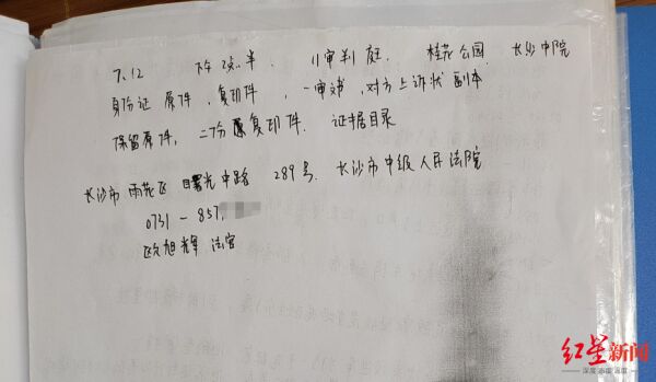7月初,张韵还和代理律师通了几次电话,在一张白纸上,她认真记下了开庭的注意事项:“7月12日、下午2点半、长沙中院、11审判庭、一审文书、证据目录。”纸的背面,是她手写梳理出的丈夫重婚生子证据。