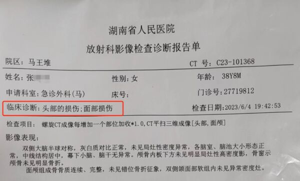 “他气急败坏回家抢手机还家暴我,把手机摔坏把电话卡取出并剪掉。”当晚,张韵向二姐张琴发了一条信息,说贺某因为她发现他的秘密,为了销毁证据打人。湖南省人民医院的诊断报告单显示,当晚7点多,张被急诊科诊断为头部和面部损伤。