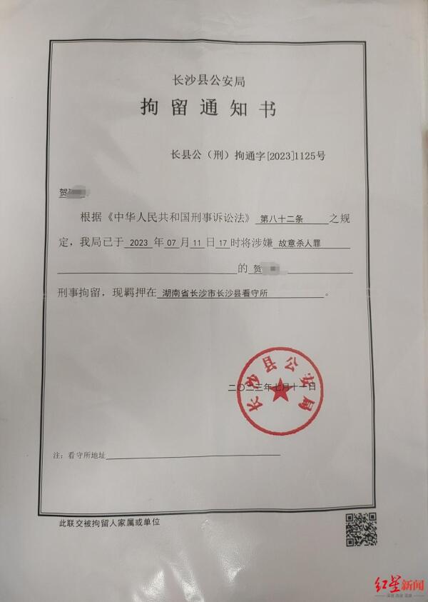 ▲7月11日17时,贺某因涉嫌故意杀人罪被刑事拘留