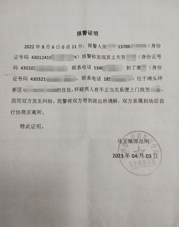 几个月后,2022年8月,张韵被熟人告知丈夫已经和黄某同居,且黄某已怀孕多月。在得到二人同进同出、一起遛狗吃夜宵的证据后,张韵和公婆一家找到了贺某的出租屋,并报警。出租屋与贺家住处同在一个社区,步行不到500米。当晚的视频显示,找到贺某时,他正躲在黄某衣柜里玩手机。当时,贺某否认二人的关系,只是称自己在帮朋友照顾孕妇。2022年底,黄某生下了一名女孩。
