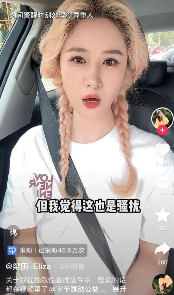 梁田在视频中愤怒地讲述了一段自己的遭遇,她表示近日和闺蜜出门时,在地铁上被一位陌生的猥琐男尾随了将近一个小时。“男子一直站在自己身边,并用一种恶心的目光偷看我,就算我无数次地背过去,不想让他看我,他都有胆量绕到我正前方,或直视,或偷瞄,或通过玻璃反射偷看我……”