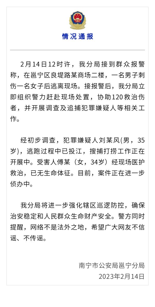 2月14日12时许,我分局接到群众报警称,在邕宁区良堤路某商场二楼,一名男子刺伤一名女子后逃离现场。接报警后,我分局立即组织警力赶赴现场处置,协助120救治伤者,并开展调查及追捕犯罪嫌疑人等相关工作。