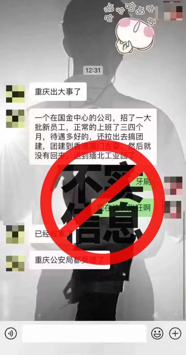 据“重庆市互联网举报中心”微信公众号消息,近日,涉“江北嘴国金中心某公司招聘新员工,正常上班数月后以‘出国团建’为由将员工送往‘缅北工业园’,重庆警方立案调查”的消息,在微信圈群和网络社交平台流传,引发部分网民关注。