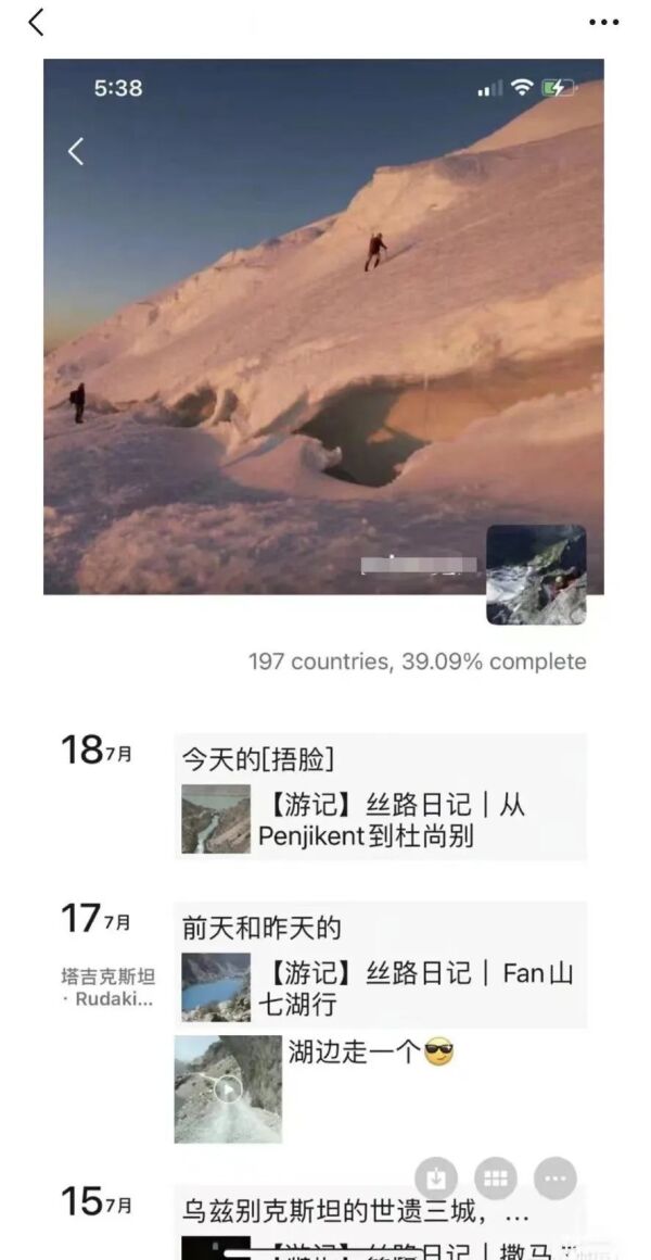 这位博主晒出的好友朋友圈截图显示,朋友圈停更在7月18日,当天的分享内容是从Penjikent(片治肯特古城,塔吉克斯坦境内遗址)到杜尚别,而7月17日发布的内容定位则显示在塔吉克斯坦。