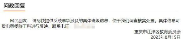 对此,8月15日,重庆市江津区教育委员会发布回复称,希望该家长尽快提供反映事项涉及的具体班级信息,便于调查核实处置。