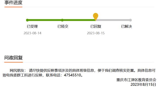 对此,8月15日,重庆市江津区教育委员会发布回复称,希望该家长尽快提供反映事项涉及的具体班级信息,便于调查核实处置。江津区教育委员会工作人员告诉九派新闻,该家长未提供具体班级信息,无法进一步作出处理。“了解具体信息后,会转给相应的科室核实处理。”该工作人员还称,若存在违规的情况,会按照相关规定进行处理。