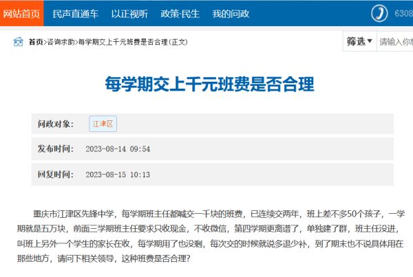 重庆网络问政平台网站消息,8月14日,有家长在该平台留言称,江津区某中学一班主任每学期收1000元班费,质问这样是否合理。该家长介绍,班上共有50个孩子,一学期就是5万元。“已连续交了两年,前三学期只收现金,第四学期更加离谱,单独建群,让另一学生家长收。”另外,该家长对班费的使用情况表示疑惑,“每学期用了也没剩的,交的时候说多退少补,到了期末也不说具体用在了哪些地方”。