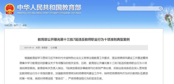 8月16日,教育部公开曝光第十三批7起违反教师职业行为十项准则典型案例。