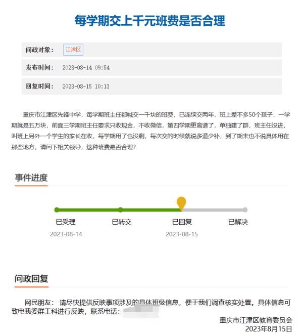 8月15日,重庆市江津区教育委员会回复该家长,希望尽快联系教委相关部门并提供反映事项涉及的具体班级信息。