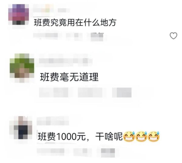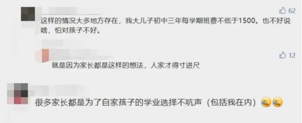 也有不少网友反馈,他们同样遭遇到高昂班费,“这样的情况大多地方存在,我大儿子初中三年每学期班费不低于1500元。也不好说啥,怕对孩子不好”“很多家长都是为了自家孩子的学业选择不吭声(包括我在内)”