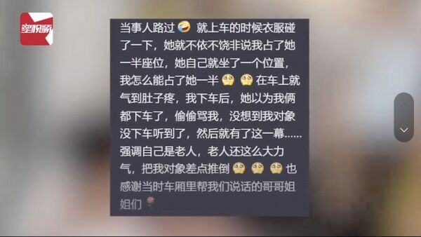 随后,大妈继续唠叨并痛斥孕妇多吃多占,引发了更多人的愤怒。孕妇的丈夫决定不再与大妈争辩,坐在空位上,默默忍受大妈的胡言乱语。最终,大妈在车站下车,结束了这场争执。事发后,当事人在社交平台上发声,当时是由于衣服不小心碰到了她,导致了口角发生。