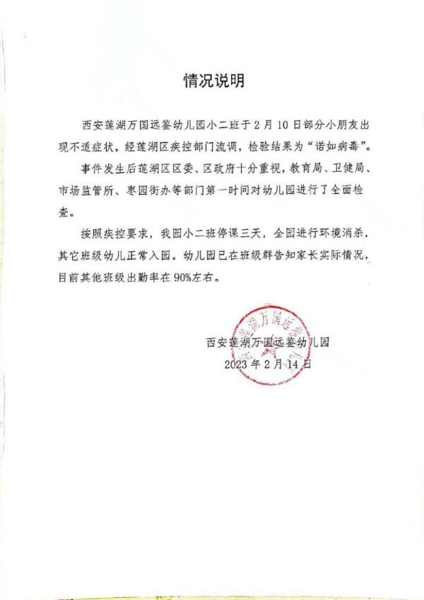 14日下午,记者联系了西安市莲湖万国远鉴幼儿园,一名老师称,2月10日该园小二班确实有几个小朋友出现了不适症状,2月11日上午莲湖区政府联合了疾控、卫健等部门到该园采样,一共有18名幼儿和3名教职工进行了采样,主要是出现不适症状或家长有疑问的幼儿参加,结果发现只有小二班有3名幼儿感染的是“诺如病毒”。随后,该园给记者发来了一份情况说明,情况说明称,经莲花区疾控部门流调,检验结果为“诺如病毒”。同时,教育、卫健等部门也第一时间对幼儿园进行了全面检查。目前,全园已经进行环境消杀,除小二班还在停课外,其他班级幼儿已正常入园。