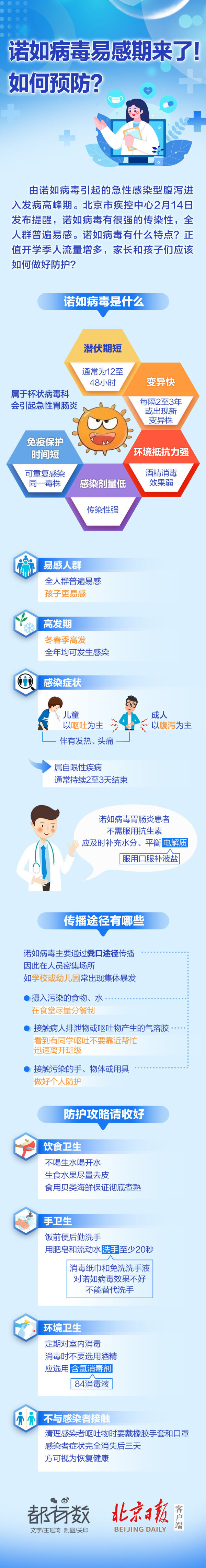 导读:北京市疾控中心2月14日发布提醒,由诺如病毒引起的急性感染型腹泻进入发病高峰期,全人群普遍易感,如何预防?一图读懂。