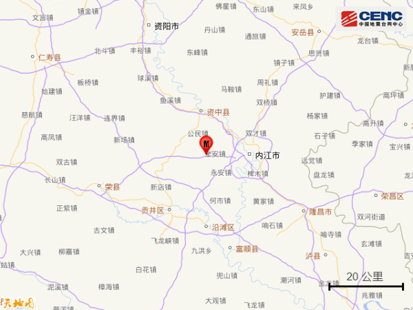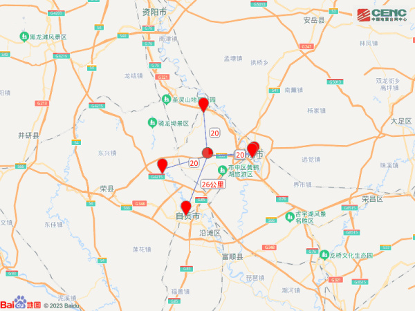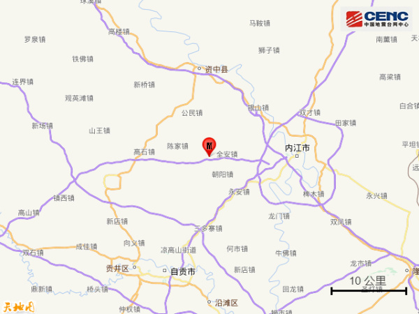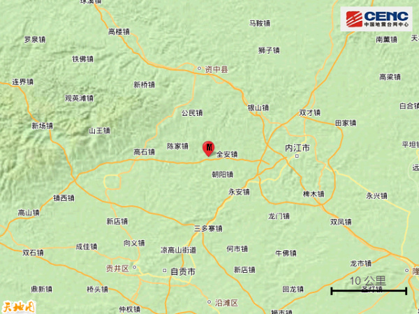 周边县城:震中距市中区19公里、距东兴区20公里、距威远县20公里、距资中县20公里、距大安区26公里,距内江市18公里,距成都市142公里。