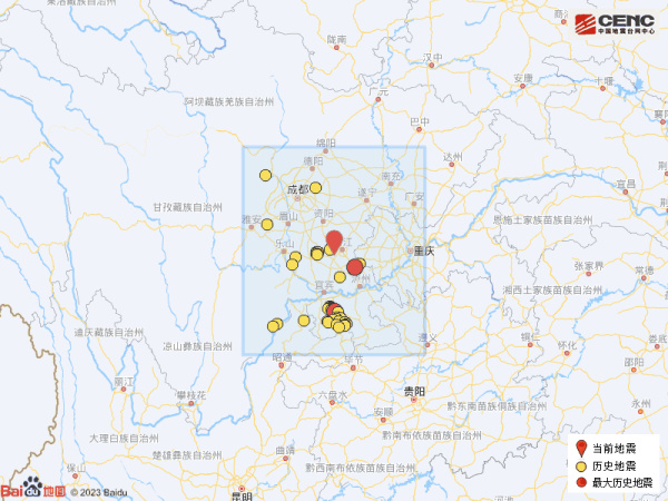 历史地震:根据中国地震台网速报目录,震中周边200公里内近5年来发生3级以上地震共307次,最大地震分别是2021年9月16日在四川泸州市泸县发生的6.0级地震(距离本次震中62公里)和2019年6月17日在四川宜宾市长宁县发生的6.0级地震(距离本次震中138公里),按震级大小前50次历史地震分布如图。