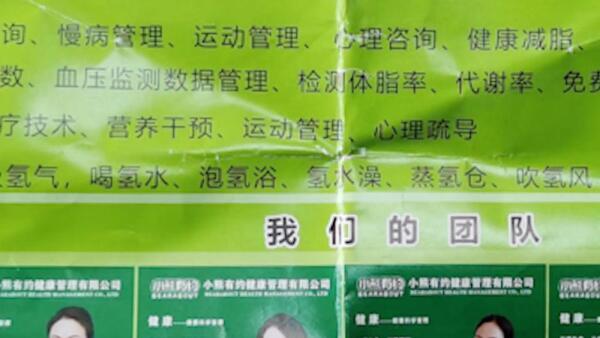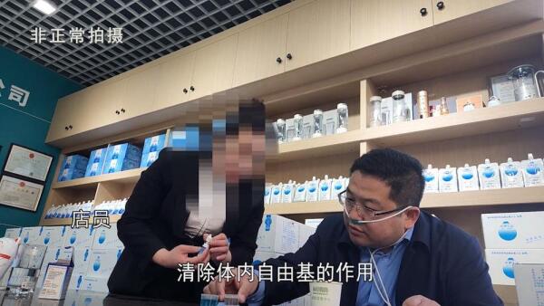 但是,他们却上演着“移花接木、借嘴说话”的把戏,墙上大屏播放着讲课视频,一位学者模样的人正在讲述“氢气四大生物学作用”、“氢医学的发展史”等内容,并循环播放所谓“日本科学家”、“美国研究机构”、“中科院院士”等研究成果,误导老人们将店里的制氢机与视频内容相关联,进而让老人们产生“本店售卖的制氢机有治疗作用”的错觉。