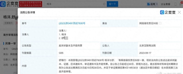 根据北京互联网法院的公告,他们已经送达了杨洋对舒某某等网络侵权责任纠纷的诉状副本和开庭传票。