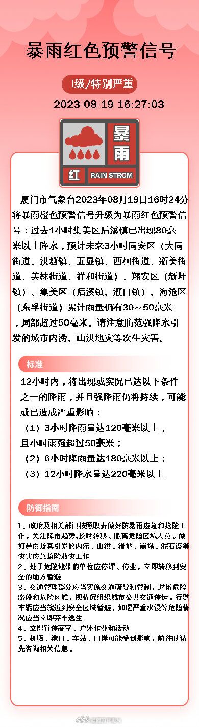 厦门市气象台8月19日16时24分将暴雨橙色预警信号升级为暴雨红色预警信号:过去1小时集美区后溪镇已出现80毫米以上降水,预计未来3小时同安区(大同街道、洪塘镇、五显镇、西柯街道、新美街道、美林街道、祥和街道)、翔安区(新圩镇)、集美区(后溪镇、灌口镇)、海沧区(东孚街道)累计雨量仍有30~50毫米,局部超过50毫米。请注意防范强降水引发的城市内涝、山洪地灾等次生灾害。