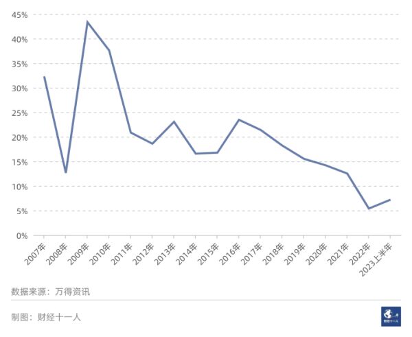 从2010年到2019年的10年间,中国住户贷款余额一直保持15%以上的增速。但从2020年开始,此数值跌破15%,2022年更是降到了5.4%。