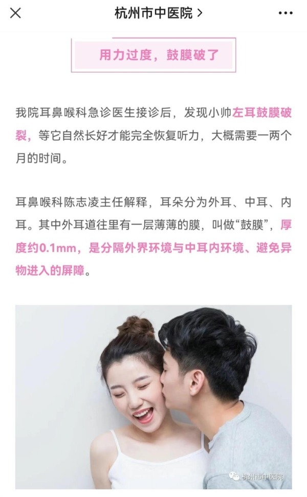 原来,热恋期的小美和小帅,在深夜的西湖边持续亲吻十来分钟后,小帅感觉左耳突然“噗”的一声响,紧接着左耳疼痛,周围的声音也模糊不清了,二人赶忙前往杭州市中医院就诊,就有了开头的一幕。